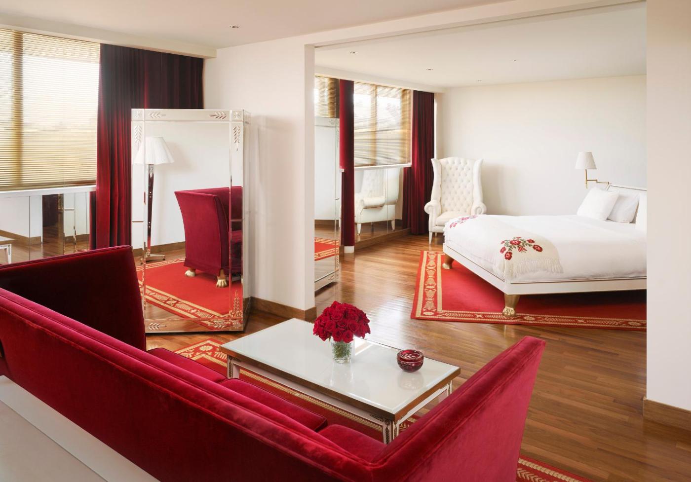 Suite Dúplex. Ubicada en el primer piso, esta suite de dos niveles ofrece una vista espectacular del horizonte de la ciudad y las hermosas copas de los árboles. Esta cómoda y elegante suite tiene una sala de estar con un sofá de terciopelo rojo, una alfombra a juego y muebles sofisticados. También tiene un baño con suelo de mármol, una bañera y un tocador de invitados separado. La habitación incluye conexión WiFi gratuita, cubrecamas artesanales y ropa de cama personalizada Faena. ;